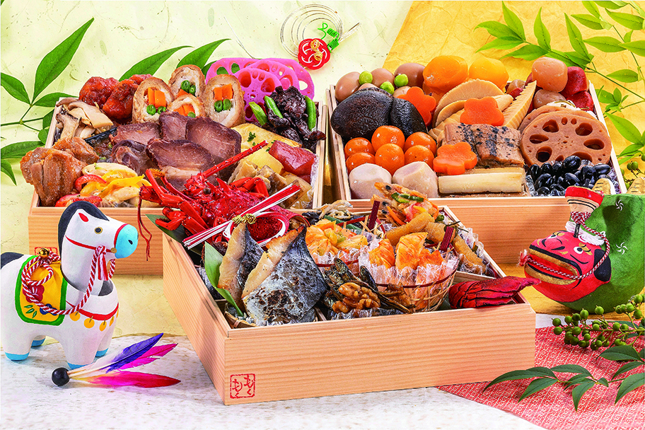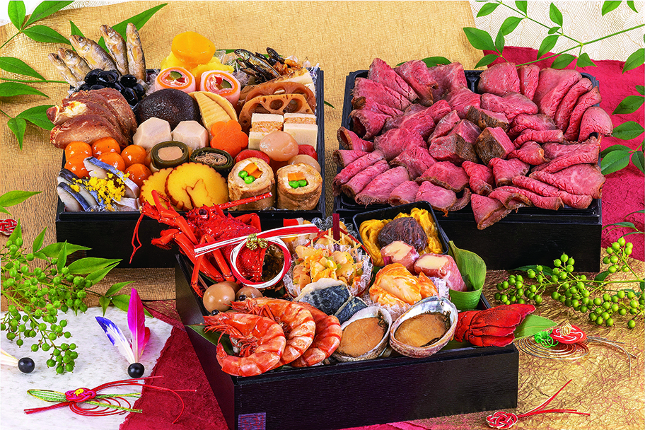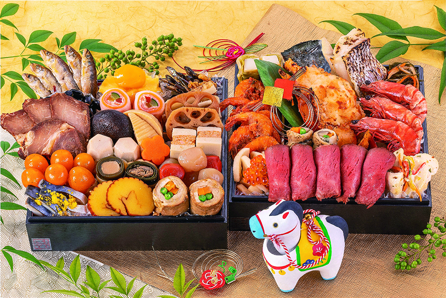 上段には「ローストビーフ」や「伊勢海老」など、新年のお祝いにふさわしい贅沢で華やかな逸品をあつめました。そして下段にはきんとんや煮しめなど、いわれある伝統的なおせち料理をバランス良く盛り込みました。
