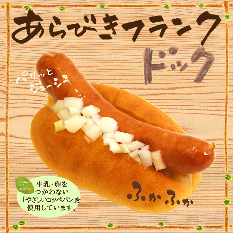 乳・卵不使用の自家製「やさしいホットドッグ用パン」に注文後焼き上げるあらびきフランクフルトを挟みました。極上のふわふわ食感のホットドッグと直火で焼いたパリッと食感のフランクの相性は抜群です。