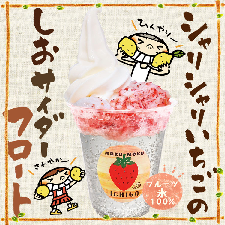 尾鷲しお学舎の甘夏塩サイダーの上に削りさちのかいちごとジャージー牧場ソフトをトッピングしました。ミルクのコクと爽やかな柑橘ソーダの相性の良い一品です。