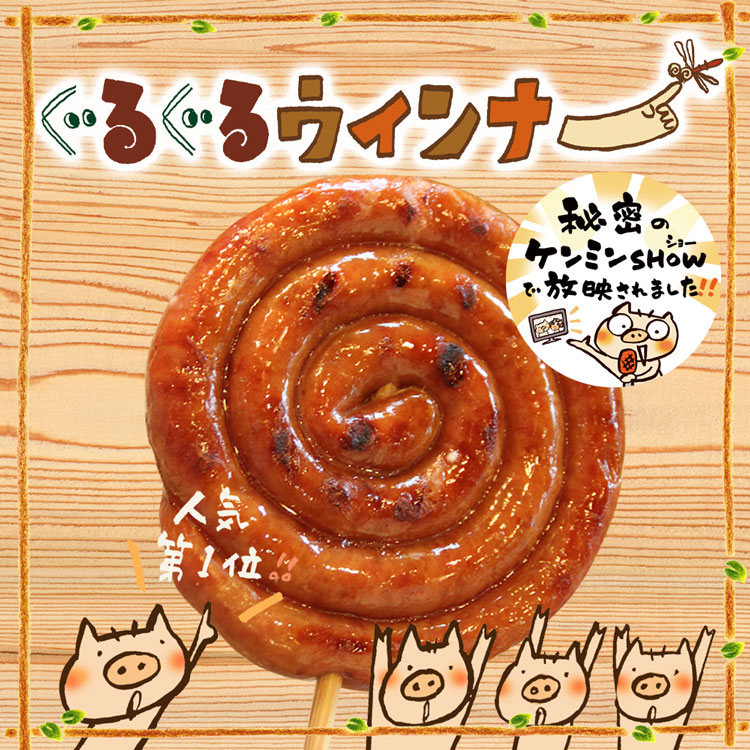 ホットメニュー人気No1のぐるぐるウインナー!約75cmの長さのウインナーをそのままぐるぐると巻いちゃいました。見た目のインパクトはもちろん、天然羊腸のパリッと食感と直火焼の香ばしさを存分に味わえる大満足の一品です。