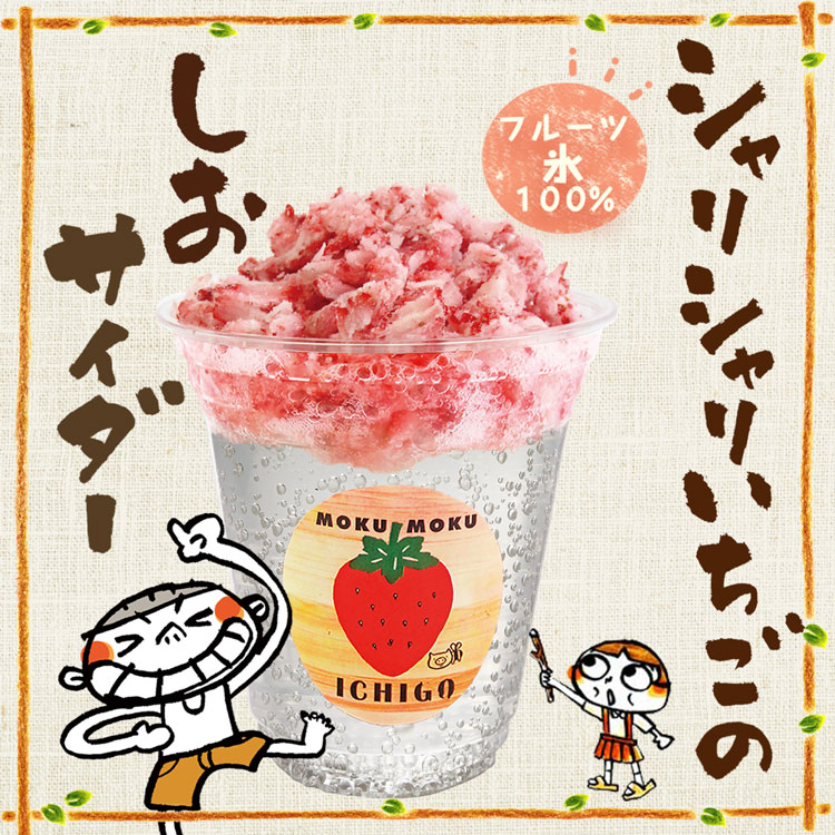 尾鷲しお学舎の甘夏塩サイダーの上に削りさちのかいちごをトッピングしました。すっきり爽やかな柑橘系のサイダーと削りさちのかいちごの酸味の相性は格別です。