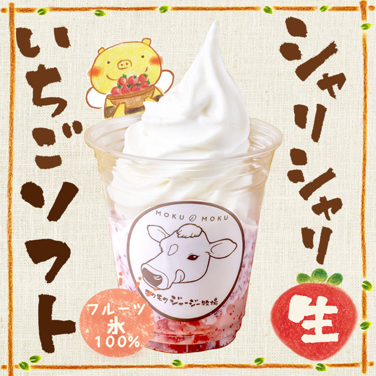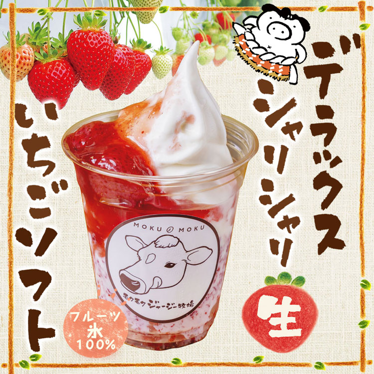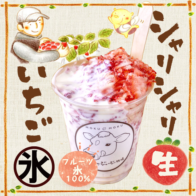モクモク牧場のジャージーミルクとモクモク農場のさちのかいちごを混ぜ合わせ、その上に削りさちのかいちごをトッピングしました。ジャージーミルクのコクとさちのかいちごの爽やかな酸味はベストマッチです。