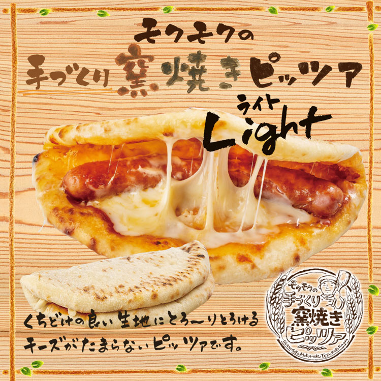 片手で簡単に食べられるお手頃サイズのピザを、と発案されたピッツァlight。もちもちの生地にあらびきウインナーをまるごと1本挟みました。軽食や運転のお供にご利用下さい。