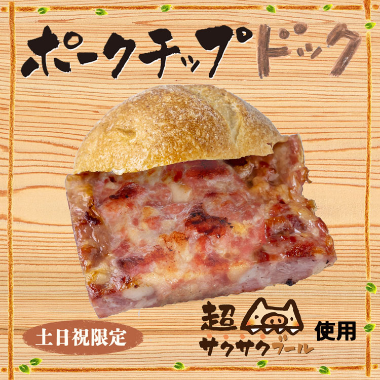 小さいサイズのポークチップステーキをモクモク特製「サクサクブール」に挟みました。サクサクっとした食感のパンの中で、ごろッと肉感のステーキソーセージが暴れるホットドックです。お手頃サイズのため、軽食や小腹がすいたときにどうぞ。