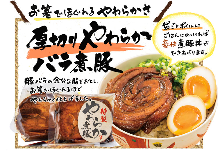 コクのある赤身と甘みのある脂身が重なり合う「豚バラ」を 脂と赤身の割合が均一になるように切り出し、煮込みに2日間かけてつくりあげています。 余分な脂を落としながら、お箸で切れるほどやわらかく茹で、 一日おいて秘伝だれでしっかりと味をしみこませて煮込んでいます。