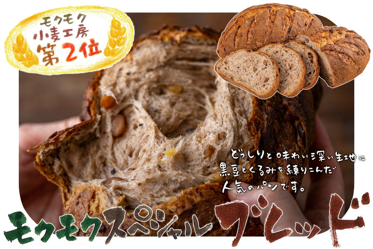 パン工房が誕生した1997年から30年ほど販売を続けるモクモクスペシャルブレッド。三重県産の小麦粉を使い「中だね製法」を用いて、小麦が持つうまみと香りを最大限引き出しました。しっとりとした地麦粉と全体の1/6の重量を占める黒豆やくるみなどのナッツの食感が楽しい個性豊かなパンです。