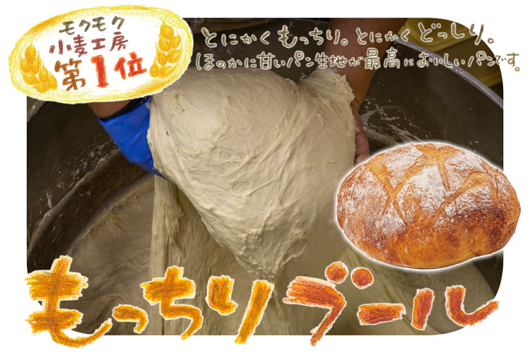 お土産人気No1!加水率100%の圧倒的なもっちり食感のパン。段階を踏んで生地に水分を抱え込ませるために「湯だね製法」を用いて3日がかりで生地をつくります。鈴鹿市からこのパンを買いに御在所サービスエリアまでご来店くださるお客さんがいるほどの唯一無二のモクモクを代表するパンです。
