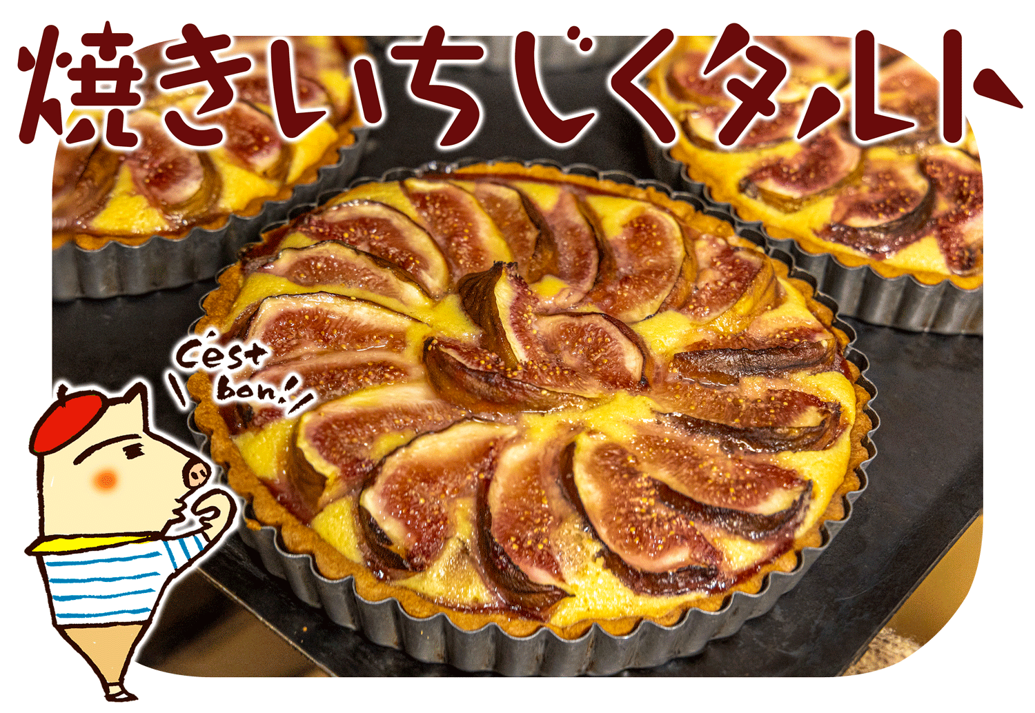 濃厚ないちじくの味わいを楽しむ「焼き」タイプのいちじくタルトです。モクモク会員さんからも評価の高い歯触りの良いクッキー生地を使用し、その上にジャージーヨーグルトで軽やかさを出したダマンドの生地を流し込みました。ダマンド生地にはアクセントとしてドライいちじくを混ぜ込み、ヨーグルトの爽やかな酸味といちじくの滋味深い甘みが調和します。その一番上には、砂糖をかけて一晩おいて水分を抜き濃厚さを出した生いちじくを並べて焼き込み、いちじく本来の甘みと食感を感じてもらえるようにつくりました。