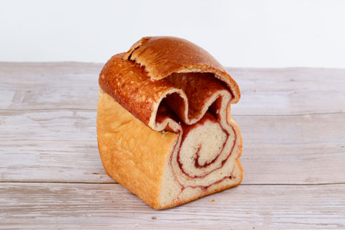 昨年12月から販売を開始した『濃い味いちごぱん』。くちどけ抜群のジャージーミルクの風味豊かな食パンに、濃厚な甘酸っぱさが特徴的なさちのかいちごジャムをひと瓶(100g)まるごと巻きこんだ贅沢なパンで、たくさんの会員さんにご好評いただいております。
