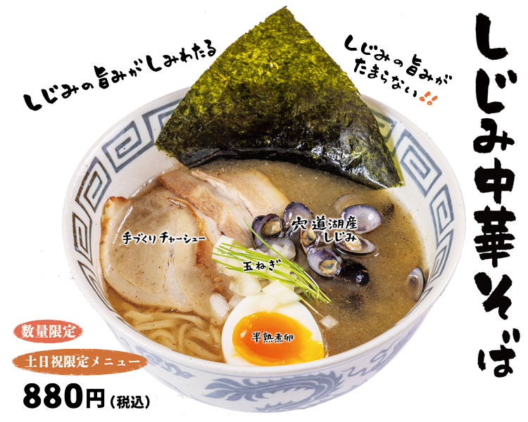 島根県宍道(しんじ)湖産のしじみを使用した中華そばです。しじみの香り高く優しいスープがよくからむように、もちもちの中太縮れ麺を使用しました。