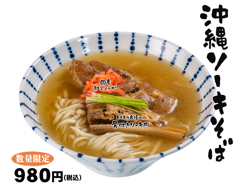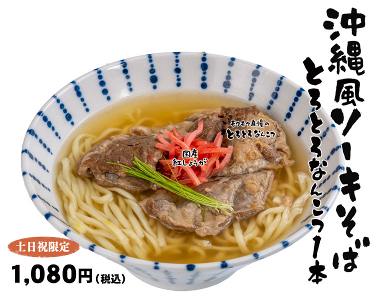 2日仕込みでつくる本格和風だしをベースに、あっさりだけど奥行きのあるソーキそばのスープに仕上げました。もちもちの本格中太縮れ麺の上には、骨付きの豚前バラ肉を4時間かけてじっくり下茹でし、秘伝の甘辛たれでさらに2時間炊き上げた「骨付きソーキ」と「しょうが天ぷら」をどどーんと乗せました。