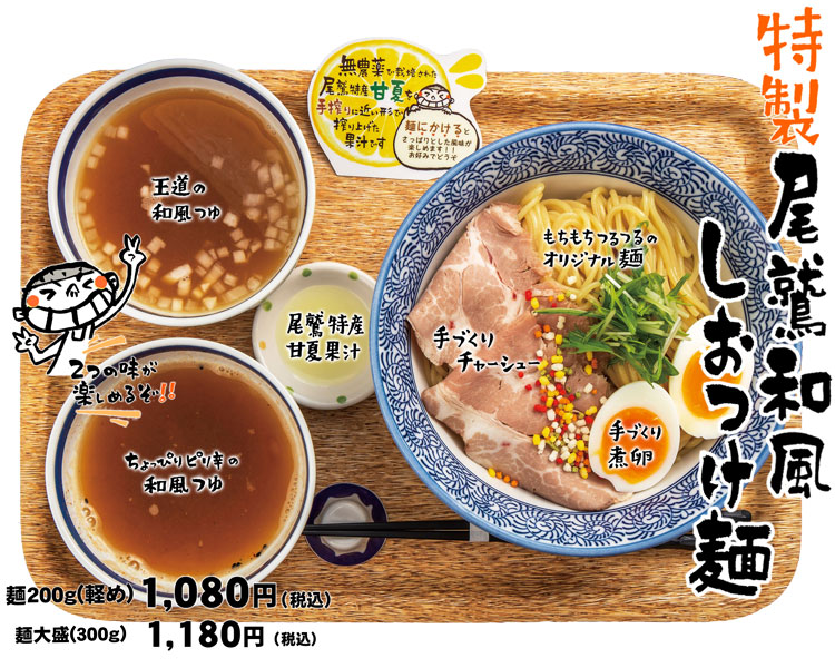 もっちりつるつるとした、のどごしの良い麺が特徴です。つけ麺に小麦粉をブレンドしているので、麺自体の香りも良く、少しとろみのある2種類の和風だしによく合います。また、お好みで別添えの尾鷲甘夏果汁をかければ、さらにさっぱり爽やかなつけ麺に変身しますよ!