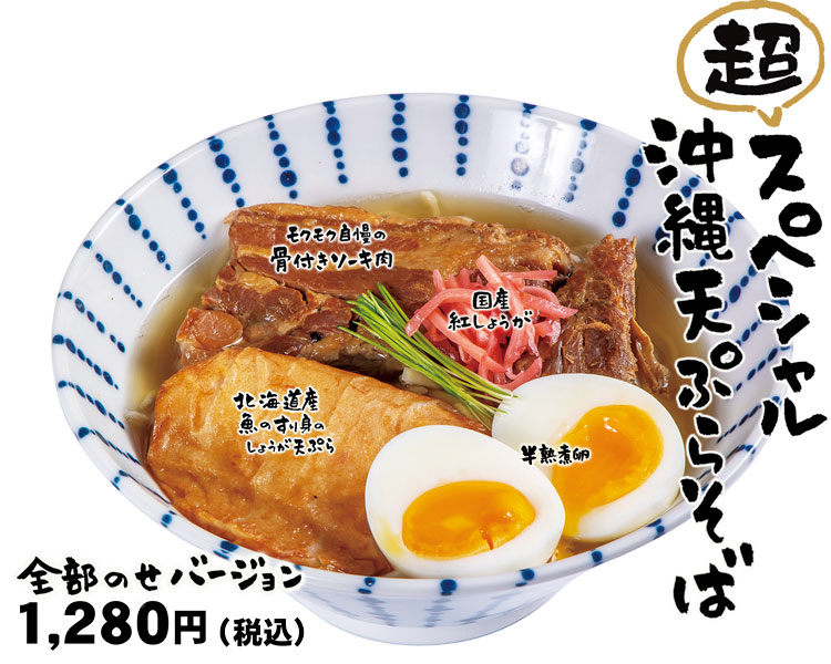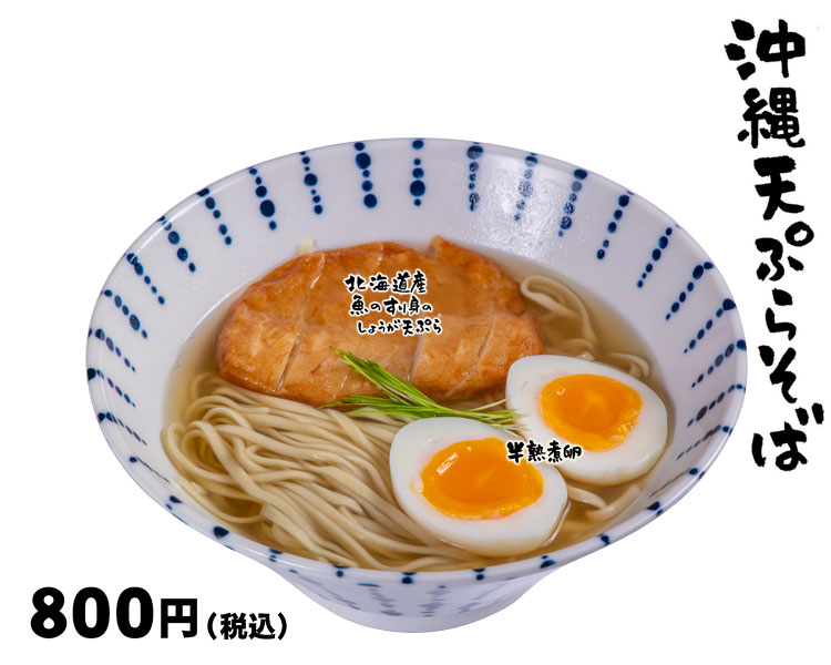2日仕込みでつくる本格和風だしをベースに、魚介の旨みなどを合わせて、あっさりだけど奥行きのあるソーキそばのスープに仕上げました。また、スープがよく絡むように、麺にはもちもちの本格中太縮れ麺を使用しました。北海道産のしょうが天ぷらのもちもちとろとろ食感がたまりません。