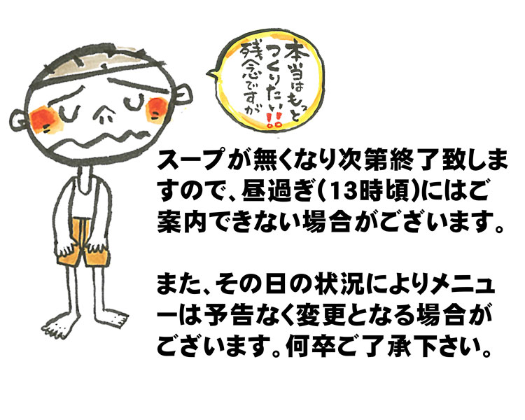 ※スープが無くなり次第終了致しますので、昼過ぎにはご案内できない場合がございます。何卒ご了承下さい。