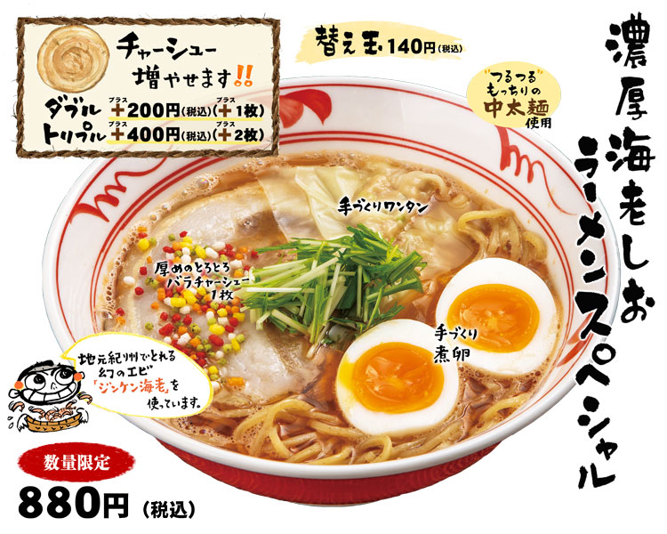 海老の香りがガツン!濃厚な紀州産のジンケンエビのスープをお楽しみいただけます。シャキシャキの水菜やモクモク特製手づくりワンタンと、海老の濃厚なスープの相性が抜群です。替え玉もご用意しています!
