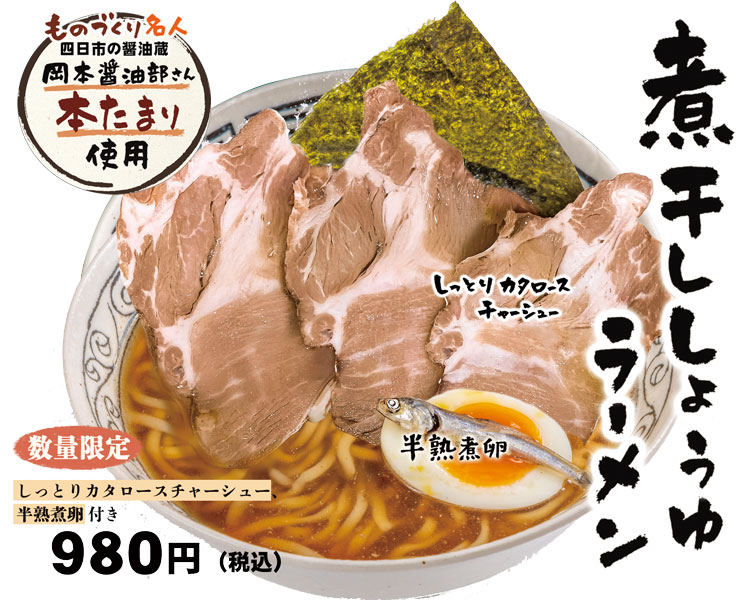 しおラーメン屋さんで初めてのしょうゆラーメンに挑戦!使用するのは四日市市の岡本醤油部『本たまり』。煮干しのパンチある旨みとたまり醤油のコクが重なり、深みを出しました。また、じわっと広がる美味しさをたまり醤油のキレですっきりと整えました。