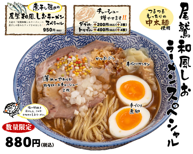 自分たちでつくる塩を合わせ、2日間かけてつくる和風だしの香りがたまらない一杯です。旨みいっぱいの和風しおスープを満喫していただくために、モクモク特製チャーシュー、かつお節、国産玉ねぎ、モクモク特製手づくりワンタン、煮卵をトッピングしました。
