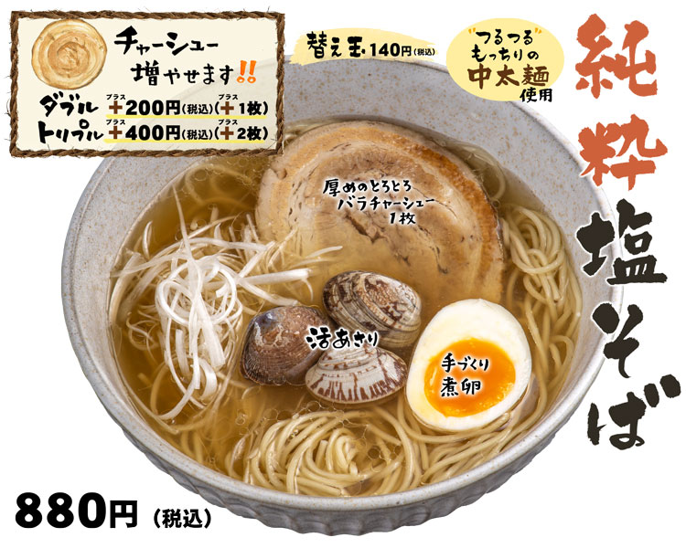 すっきりとした味わいの塩そばです。いろいろな味を重ねていくのではなく、「手づくりの塩」と「手づくりのだしスープ」の「旨み」と「香り」が引き立つように考えた一杯です。替え玉もご用意しています!