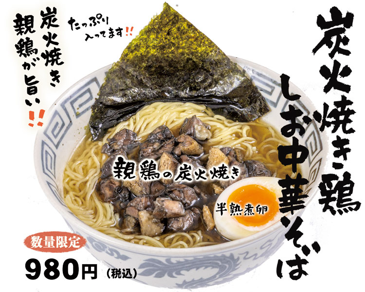 モクモク通販で新発売した『親鶏の炭火焼き』をどどーんとたっぷりトッピングしました。親鶏の炭火の香りが移ったスープと細ちぢれ麺が絡み合い、濃厚な味わいを持つラーメンが出来上がりました。