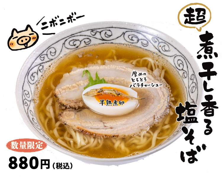 「手づくりの塩」と「手づくりのだしスープ」の旨みを引き立たせた塩味に、スープの材料はもちろんオイルにもこだわり、煮干しの香りをガツンと効かせました。あっさりだけども旨みの強い煮干しのスープがよく絡むように、中太縮れ麺を使用しました。