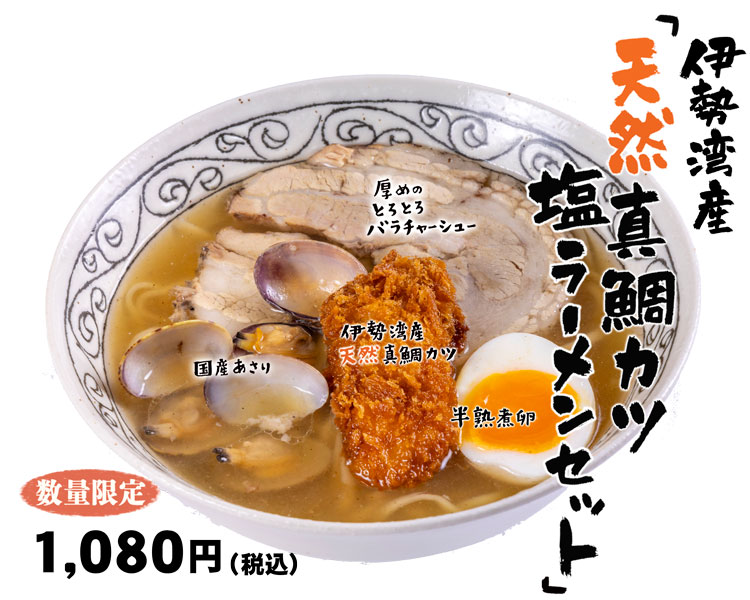 手づくりの塩と手づくりのだしスープでつくる、旨みと香りが引き立つ塩そばに伊勢湾でとれた「天然真鯛」のフライを贅沢にトッピングしました。