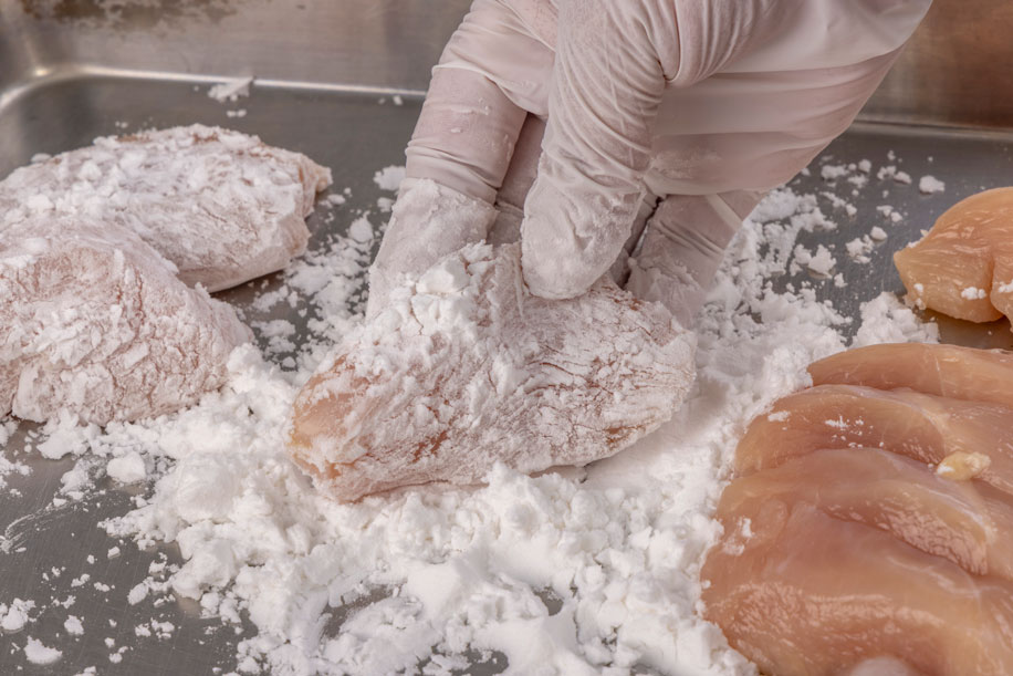 ①鶏むね肉を添付の粉にまとわせる。