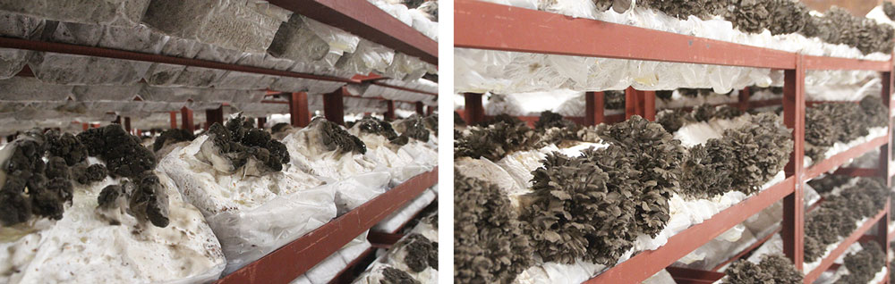 光の量を管理することで、色が黒く、傘の先までピンとした肉厚で食感の良いまいたけができるようです。