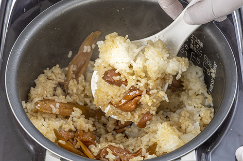 炊飯器で2合のご飯を炊いたら、袋ごとボイルで温めておいた「鶏ごぼうめしの素」を混ぜて蒸らすだけ!