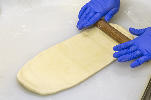 ①一次発酵を終えた生地を均一に長く伸ばす。