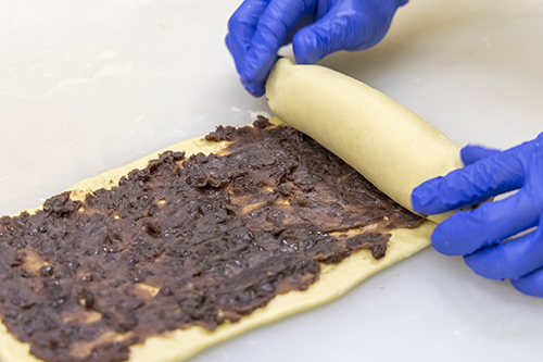 パン生地をなるべく均一に長く伸ばす工程や、つぶあんを適度な厚みに均一に伸ばす工程など技術が必要ですが、一本丸ごと一気にあんを巻き込むことで、これまで生地と生地のつなぎ目にできてしまっていた「あんのない部分」がなくなり、どこを切ってもつぶあんが出てくるあん食ぱんに生まれ変わりました。