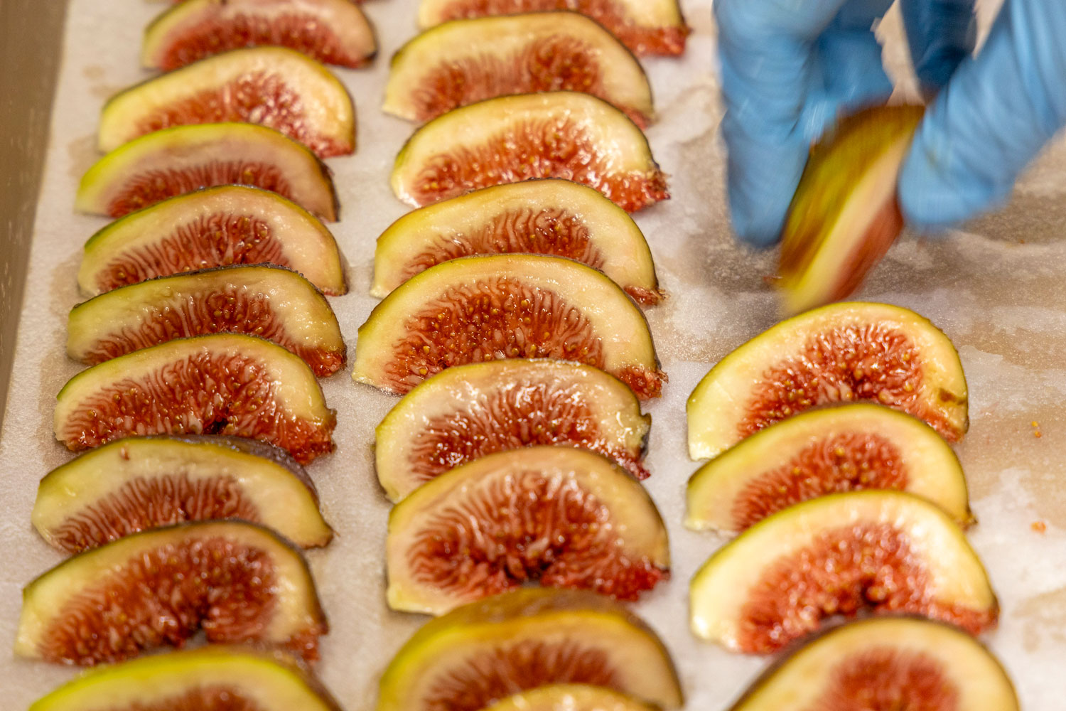 濃厚ないちじくの味わいを楽しむ「焼き」タイプのいちじくタルトです。モクモク会員さんからも評価の高い歯触りの良いクッキー生地を使用し、その上にジャージーヨーグルトで軽やかさを出したダマンドの生地を流し込みました。ダマンド生地にはアクセントとしてドライいちじくを混ぜ込み、ヨーグルトの爽やかな酸味といちじくの滋味深い甘みが調和します。その一番上には、砂糖をかけて一晩おいて水分を抜き濃厚さを出した生いちじくを並べて焼き込み、いちじく本来の甘みと食感を感じてもらえるようにつくりました。