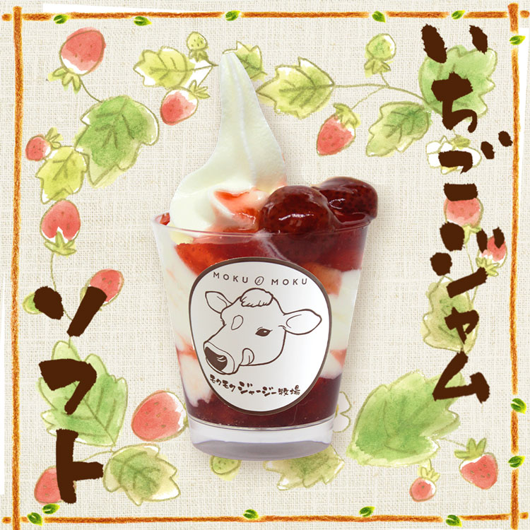モクモク農場のさちのかいちごをやさしく炊き上げたいちごジャムをソフトクリームにトッピングしました。ぺろりと食べれるお手頃サイズのソフトクリームです。