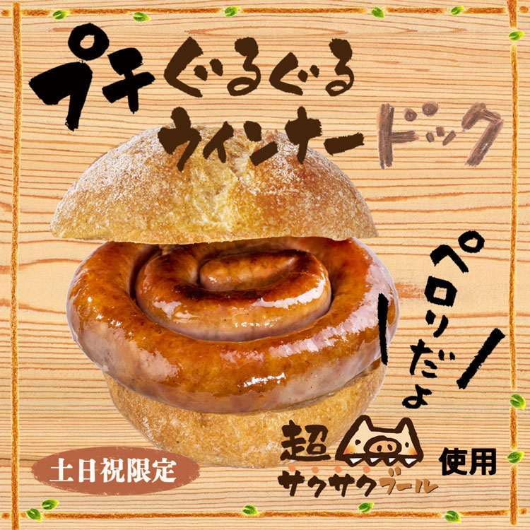 小さいサイズのぐるぐるウインナーをモクモク特製「サクサクブール」に挟みました。サクサクっとした食感のパンの中でパリッとジューシーなウインナーが弾けるホットドックです。お手頃サイズのため、軽食や小腹がすいたときにどうぞ。