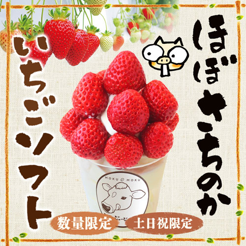 この時期しか味わえないモクモク農場「さちのかいちご」小粒を贅沢にトッピングしたソフトクリームです。土日、数量限定で販売します。直営農場で獲れた完熟のプチいちごをソフトクリームが隠れるほどまでトッピングしました。この時期だから、モクモクだから味わえる特別なソフトクリームです。