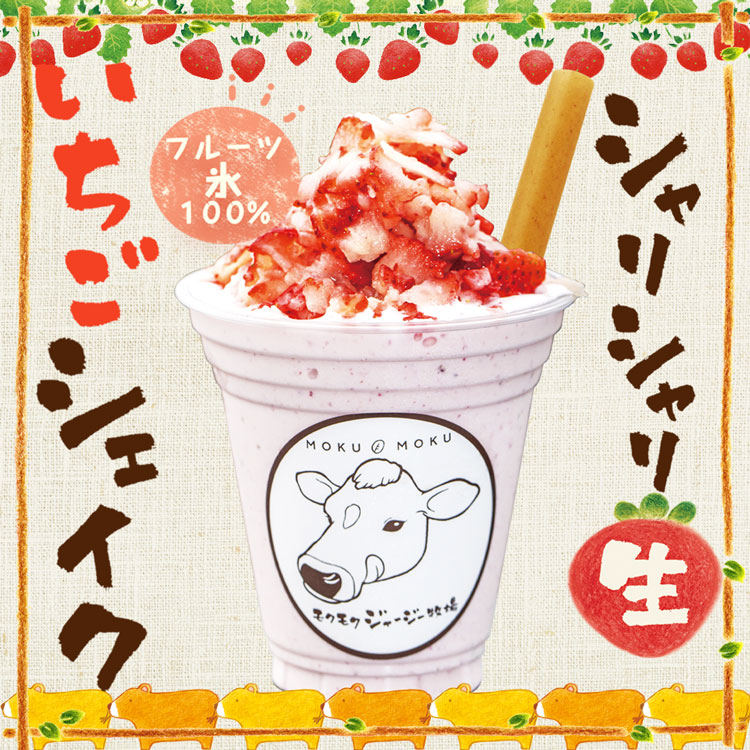 モクモク牧場のジャージーミルクとモクモク農場のさちのかいちごを混ぜ合わせ、その上に削りさちのかいちごをトッピングしました。ジャージーミルクのコクとさちのかいちごの爽やかな酸味はベストマッチです。