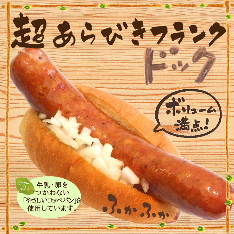 長さ約20cm、150g超えの大きなあらびきフランクを、乳・卵不使用の「やさしいホットドッグ用パン」に挟みました。粗い挽き目の肉感と、黒胡椒・ガーリックの効いた大人なソーセージはヤミツキになること間違いなし。一本で大満足の一品です。