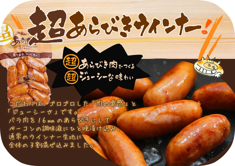 通常のウインナー生地に超あらびきの豚バラ肉を混ぜ込むことで、まるで肉にかぶりつくような豪快な食感を楽しむことが出来る超あらびきウインナーです。