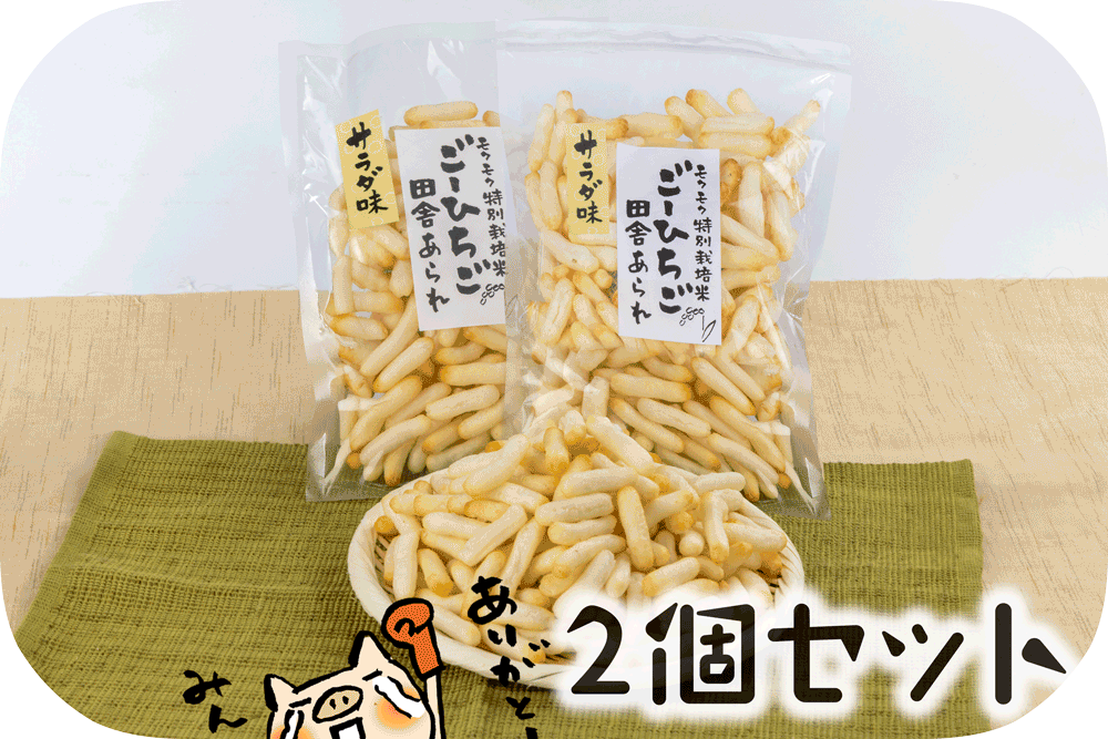 モクモク特別栽培米「ごーひちご」もち米100%使用の田舎あられサラダ味を2個セットでお得に販売します。ごーひちご米の甘みと塩味が調和し、 食べ進める手が止まりません。