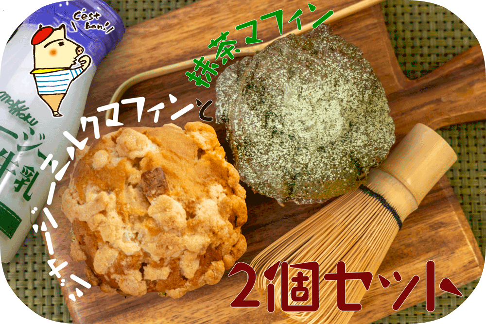 ジャージーミルクマフィンと抹茶マフィンをセットにして、少しお求めやすい価格でご提供します。ジャージーミルクマフィンはモクモク牧場のジャージーミルクをたっぷりと使ったミルキーな味わいのマフィンです。ゴロっと入ったホワイトチョコとザクザクのクッキー生地で食感と味わいにアクセントを持たせました。抹茶マフィンは、伊賀抹茶をねりこんだ生地の中に、抹茶クリームを入れて焼き上げた、ほろにがさがクセになるちょっぴりおとな味のマフィンです。