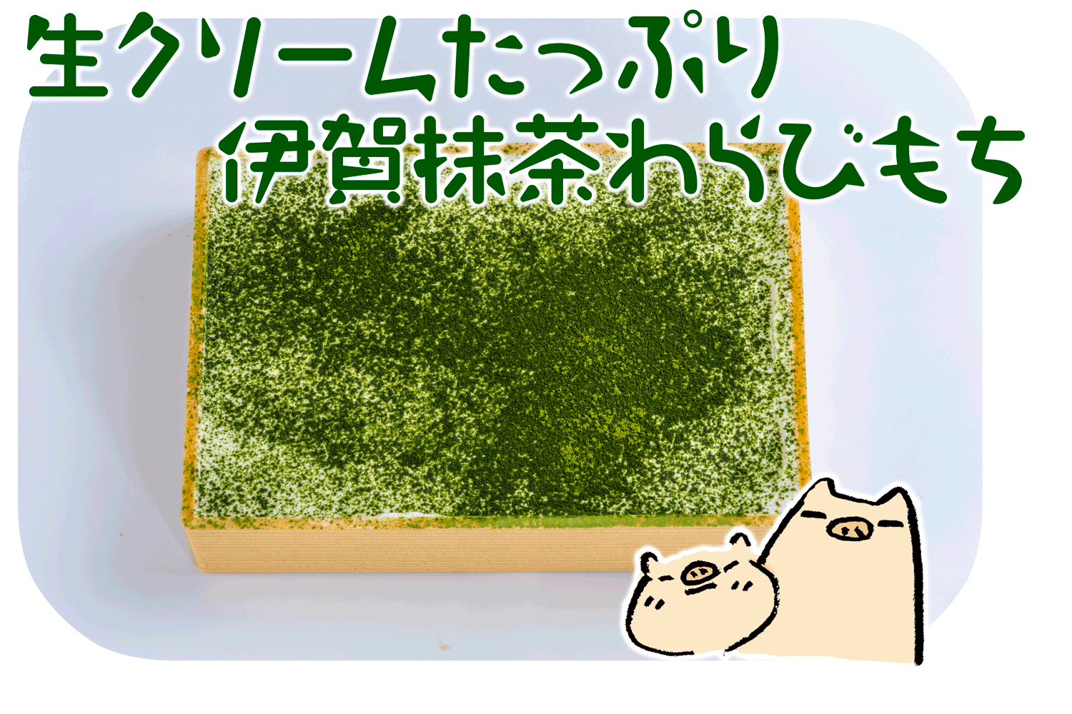 香り高い伊賀抹茶を使ったとろとろ食感のわらびもちに生クリームをたっぷりのせました。伊賀抹茶のほどよい苦味があと口をすっきりとさせる大人のわらびもちです。