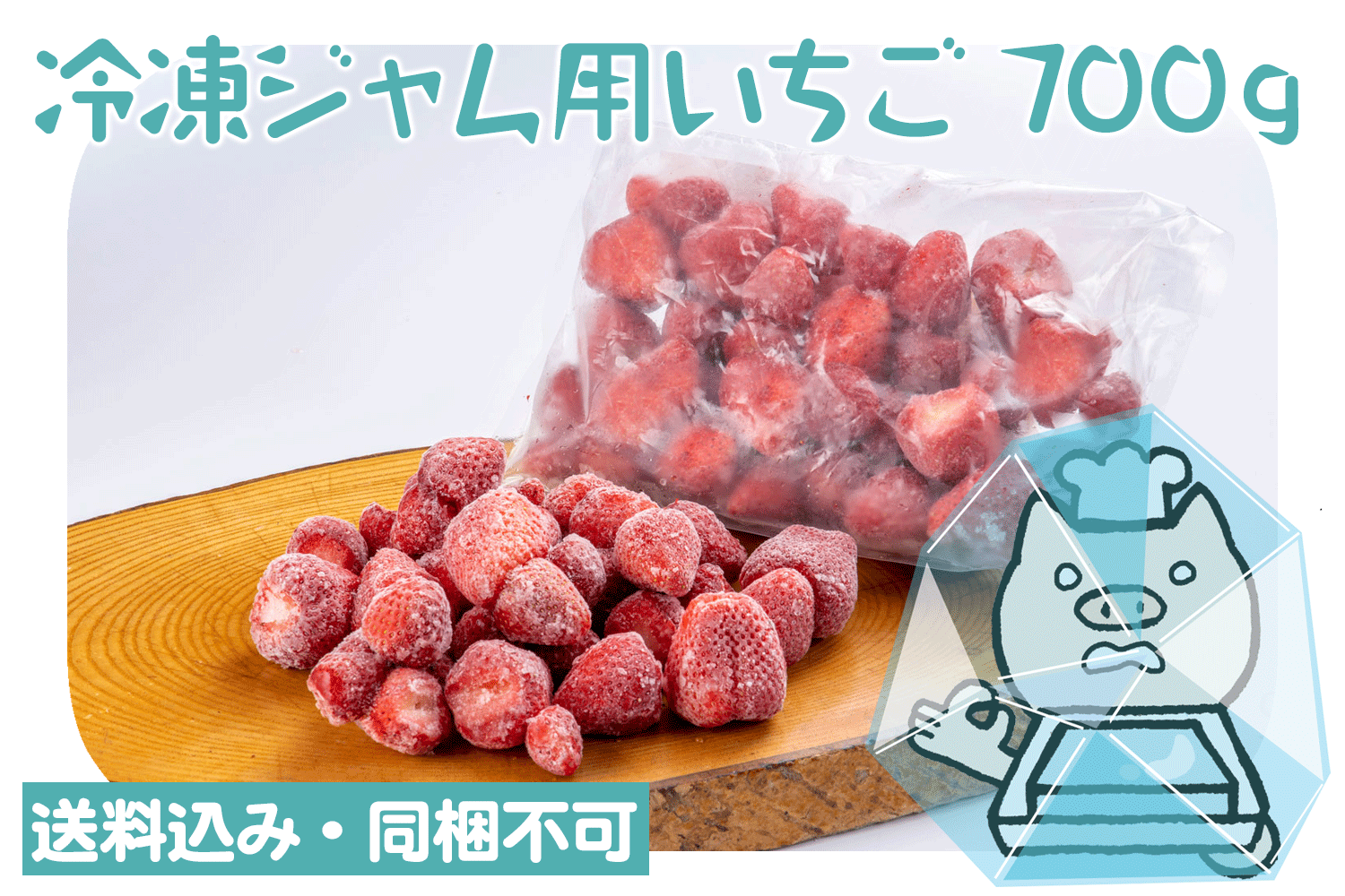 モクモク直営農場の「さちのかいちご」を収穫後、ヘタを取って冷凍したジャム用のいちごです。いちごは収穫終盤の4月~5月にかけて収穫量が非常に多くなりますが、高温で傷みが早いため生の状態でお届けするのが難しくなります。せっかくなので冷凍状態で保存して加工用にご利用頂けるようご用意しました。モクモク流いちごジャムのつくりかたのリーフレットを一緒にお届けしますので、ご家庭で実がゴロゴロと入ったジャムを簡単におつくりいただけます。