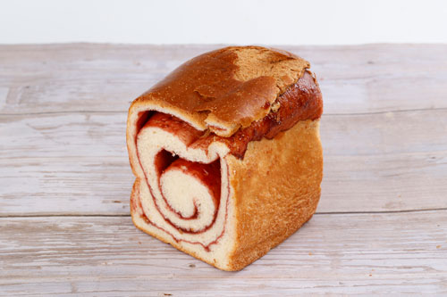 昨年12月から販売を開始した『濃い味いちごぱん』。くちどけ抜群のジャージーミルクの風味豊かな食パンに、濃厚な甘酸っぱさが特徴的なさちのかいちごジャムをひと瓶(100g)まるごと巻きこんだ贅沢なパンで、たくさんの会員さんにご好評いただいております。