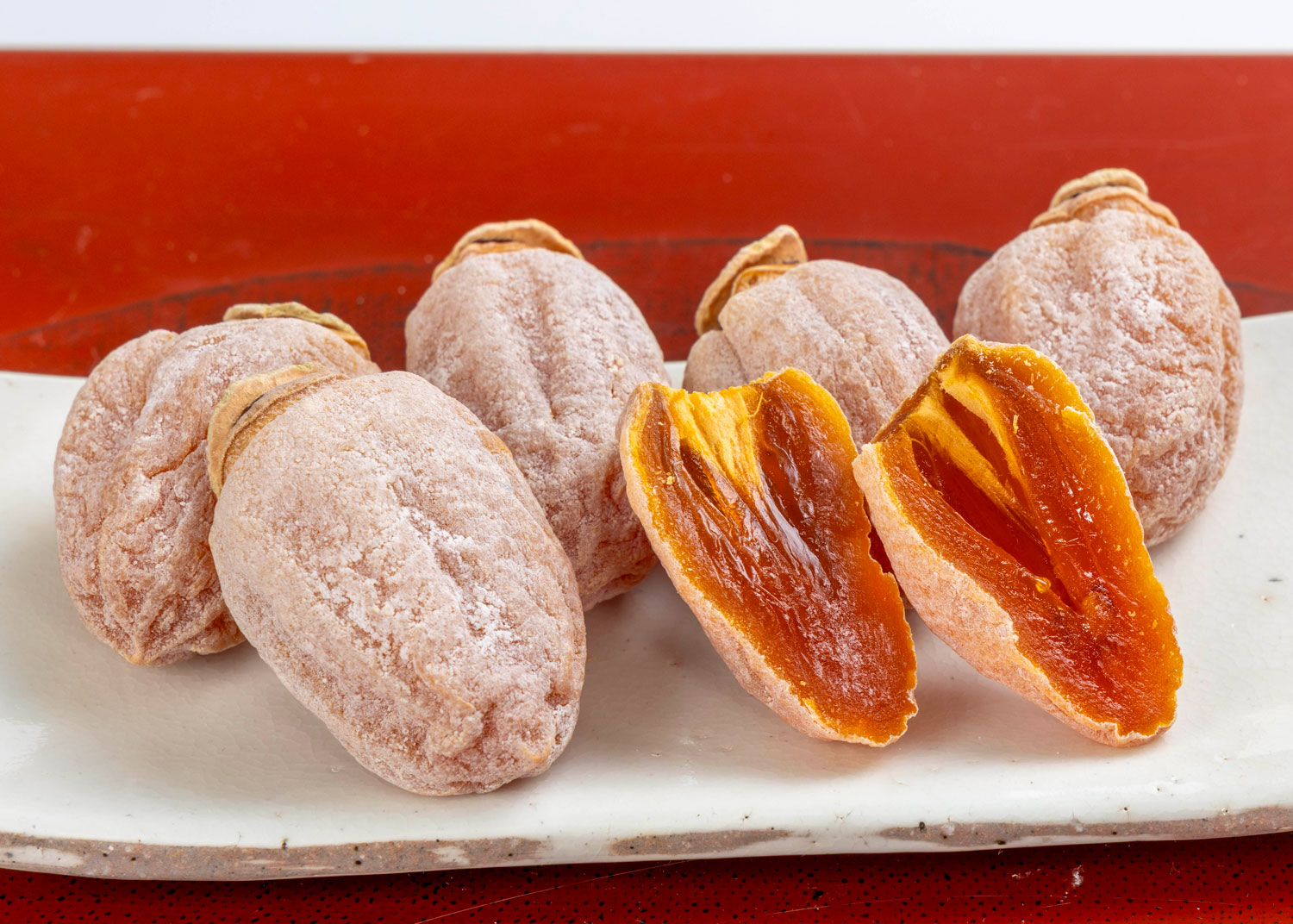 表面は白い糖分に覆われていますが、ひと口かじるともっちりとした食感と鮮やかなオレンジ色、上品な甘さが多くのファンを魅了します。長野県では、市田柿の中に栗きんとんを詰めた和菓子や、市田柿でバターを挟んだりチョコレートをかけた洋菓子まで存在するほど、甘さや食感、見た目に定評があります。