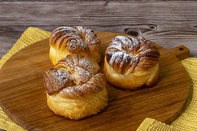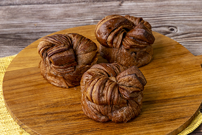 外がクロワッサンのようにサクサクッ、中はもちふわ食感のおいしさの秘密は、バターをたっぷり織り込んだデニッシュ生地をベーグルのようにくるっと巻いて焼き上げていることです。