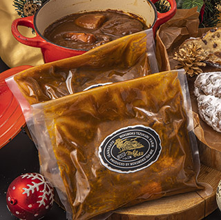 このスネ肉と野菜を、漬け込みのワインを使ってほろほろになるまで煮込んだ本格ビーフシチューです。1パックあたりたっぷり400g入っていますので、ご家族でお召し上がりいただけます。