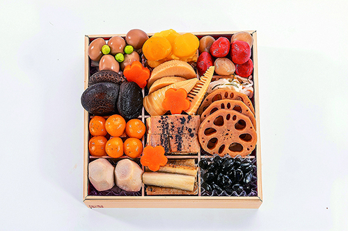 うずらの煮卵、人参の煮しめ、紅白こんにゃくの煮しめ、椎茸の煮しめ、筍の煮しめ、レンコンの煮しめ、里芋の煮しめ、栗きんとん、たたきごぼう、柿なます、金柑の甘露煮、黒豆のふっくら煮、あなごのしんじょう風